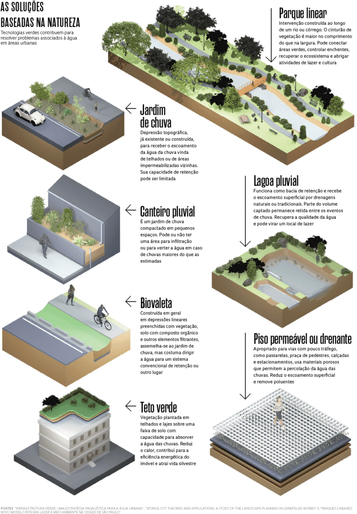 Mencionamos alguns exemplos associados a este tipo de projeto: os jardins de chuva, o canteiro pluvial, a biovaleta, o teto verde, o parque linear, a lagoa pluvial e o piso permeável ou drenante.21